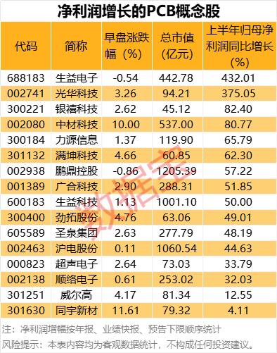 8月15日早盘,A股PCB概念多股涨停,截至午间收盘,中富电路、国际复材“20cm”涨停,宏和科技、中材科技、诺德股份、东材科技涨停,其他还有久日新材、同宇新材、铜冠铜箔涨幅超过10%。