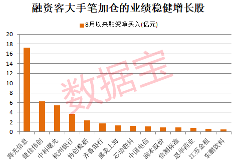 据数据宝统计,上述45只业绩稳健增长的股票中,8月以来融资净买入超亿元的有9股,包括海光信息、捷佳伟创、中科曙光、杭州银行、协创数据等。