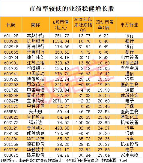 据数据宝统计,从估值水平来看,截至8月18日收盘,这45只业绩稳健增长的股票中,滚动市盈率低于30倍的有23股。其中5股滚动市盈率低于10倍,分别是常熟银行、杭州银行、青岛银行、齐鲁银行、捷佳伟创。