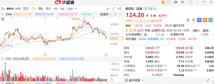 华盛资讯2月26日讯,美伊谈判情绪紧绷,美股三大指数早盘大幅跳水,纳指跌超2%;中概股随大市下挫,百度绩后大跌逾6%。